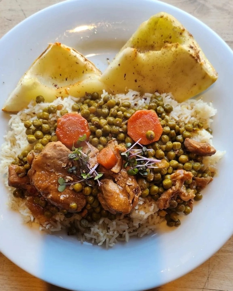 Ce midi ça vous dit un émincé de filet mignon aigre doux au petit pois, du riz au gingembre et des pâtissons au 5 épices chinois ? Oui ?!? Alors viens donc au K fée des jeux !