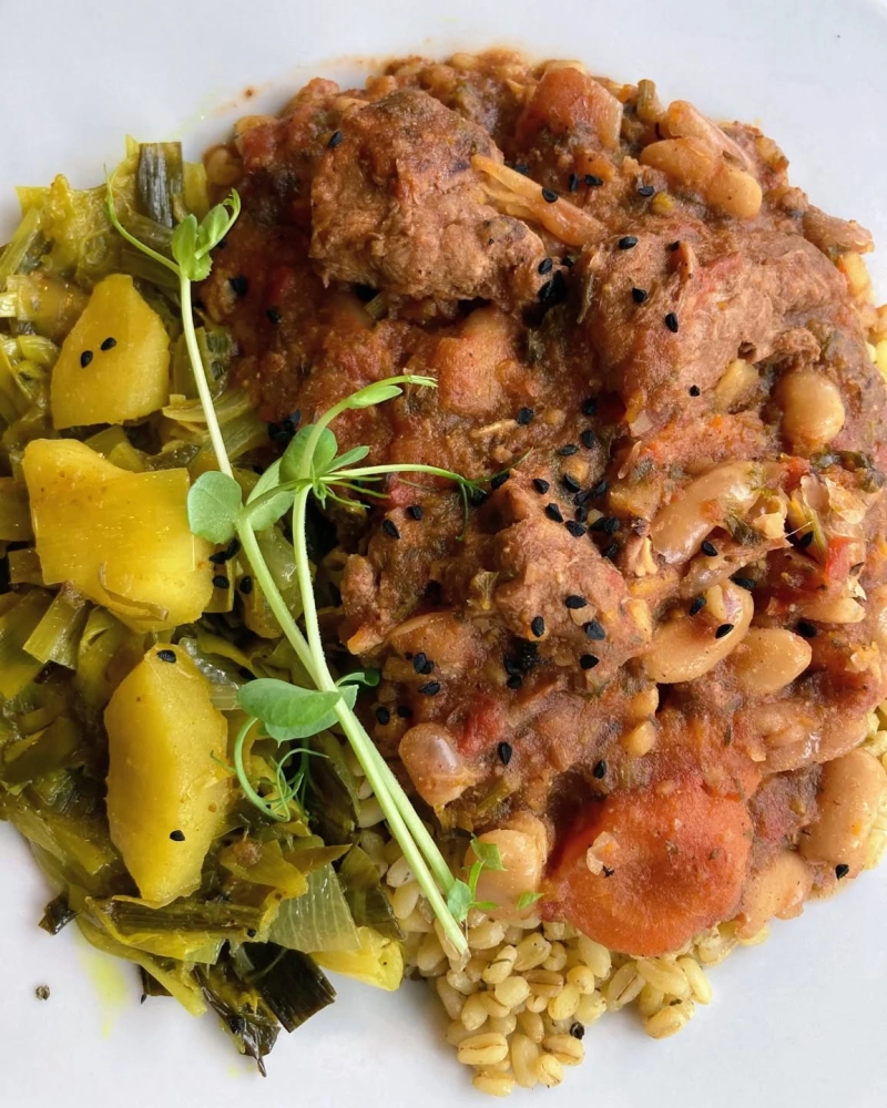 Ce midi pour vous réchauffer et combattre la grisaille un petit plat du jour dans les règles de l’art ça vous dit ? Un bon mijoté de veau aux haricots blancs et à la courge, un peu de fondu de poireaux aux pommes et du blé mondé aux épices. Bon app’ !